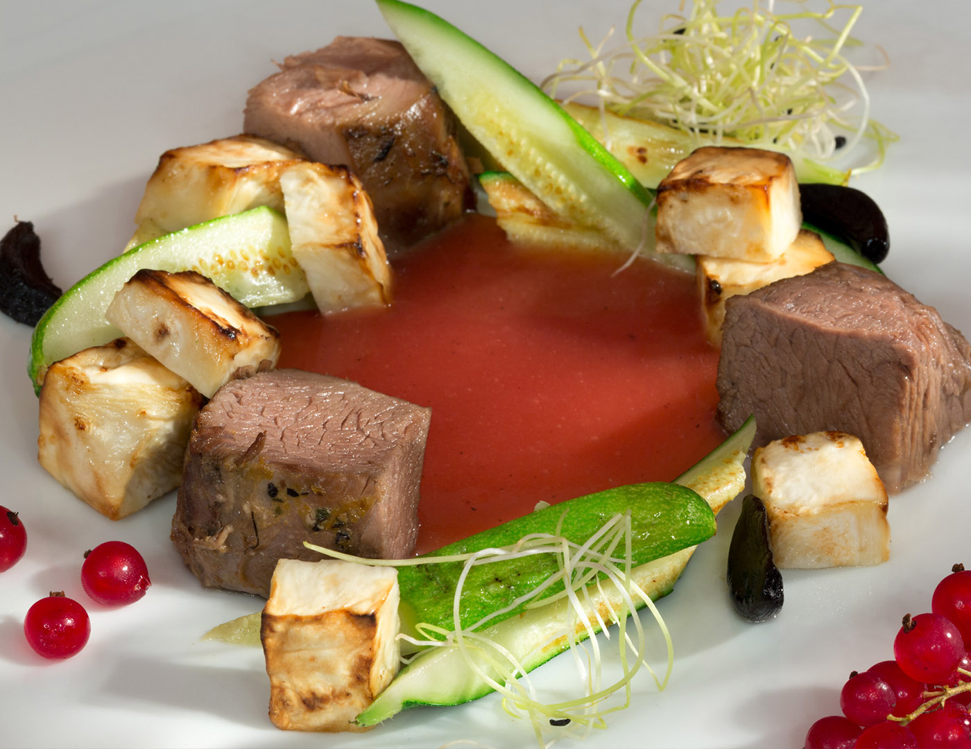 Pearoog: Hirvepihv kuremarja ja metsapähkliga, veinikaste, karamellitud köögiviljad